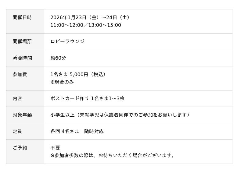 京友禅の伝統技法である「型彫(かたほり)」が体験できます。型紙を彫るための錐(きり)を用いお好みのデザインを彫り、カラーチョークとパフを使って絵柄をポストカードに刷り込みます。京の伝統の技に触れる特別な体験を、手軽にお楽しみください。