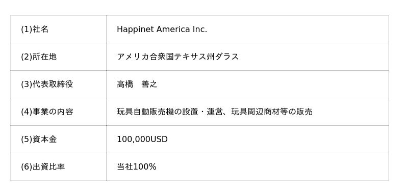 株式会社ハピネット(本社:東京都台東区、代表取締役社長:水谷 敏之、証券コード:7552、以下当社)の子会社であるHappinet America Inc.(本社:テキサス州ダラス、代表取締役社長:高橋 善之)は、株式会社バンダイ