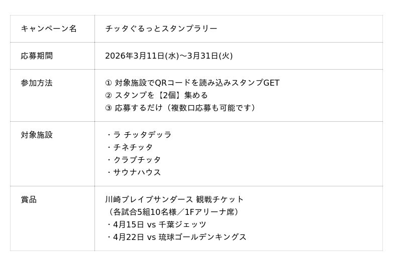本キャンペーンは、チッタグループの複数施設を巡ることで、ショッピング・グルメ・映画・ライブ・サウナなど多様な体験を楽しみながら参加できるスタンプラリー企画です。