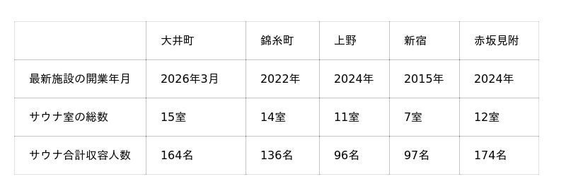 - 最新施設の開業年月:2026年3月(サウナメッツァ大井町トラックス)
