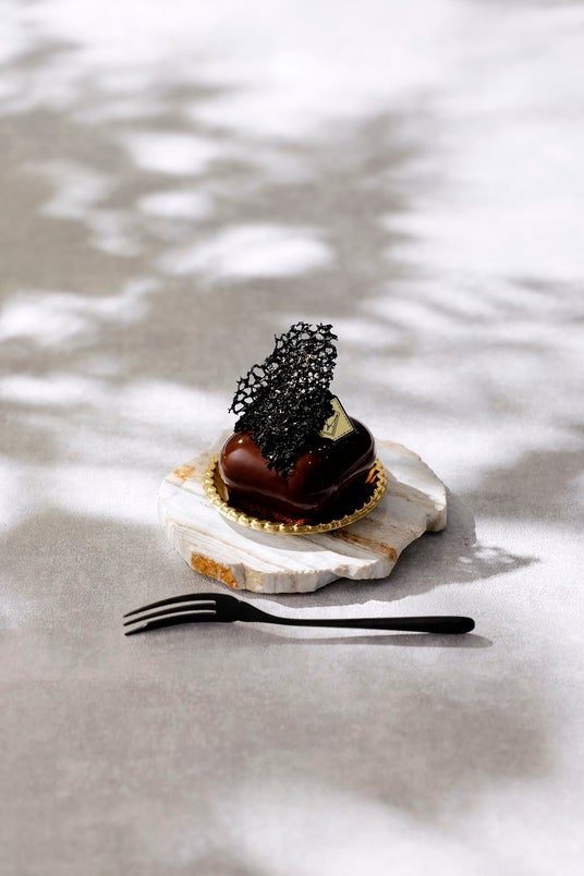 希少なホワイトカカオを使用したショコラムースのベースに、黒ごまとコーヒーのクリームを重ね、黒からグレー、そして淡いベージュへと移ろう層によってモノトーンの階調を表現しています。カットした断面にも柔らかなグラデーションカットが。展示テーマに呼応するように、外観の静かな佇まいと、断面に現れる層の表情によって、内と外の対比をささやかに表現しています。