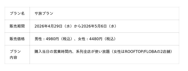 居場所事業、エンターテイメント事業を展開する株式会社メッセプロパティー(本社:東京都港区、代表取締役:宮本 茂)が運営する中央線沿線のサウナ・スパ・コワーク施設、ROOFTOP(西荻窪)、MONSTER WORK&SAUNA(吉祥寺)、FLOBA(三鷹)は、2026年4月29日(水)から2026年5月6日(水)まで、系列全店使い放題となるお得なパッケージプラン「サ旅プラン」を販売します。