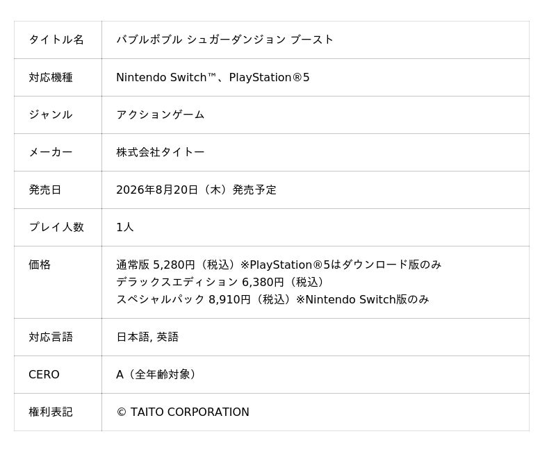 『バブルボブル シュガーダンジョン ブースト』公式サイト:https://www.taito.co.jp/BBSD『バブルボブル』シリーズポータル:https://www.taito.co.jp/bub
