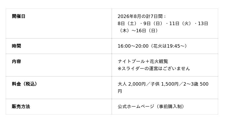 開業10周年の特別企画として、お盆期間限定のナイトプールイベント「スターライト・ラグーン」を開催いたします。夜空にきらめく花火を眺めながら、大自然のプールで涼む--日中の興奮とはまったく異なる、夏の夜だけの特別な水辺のひとときをお届けします。