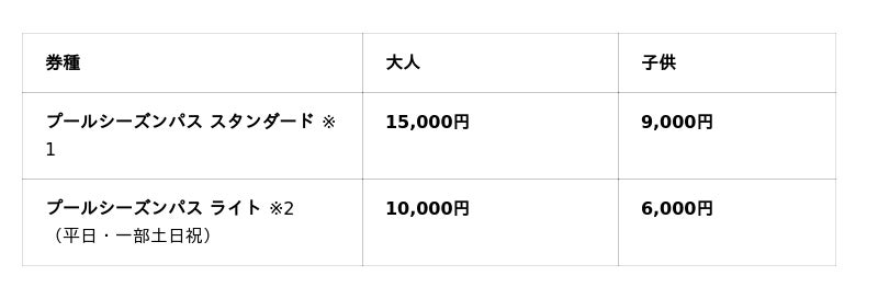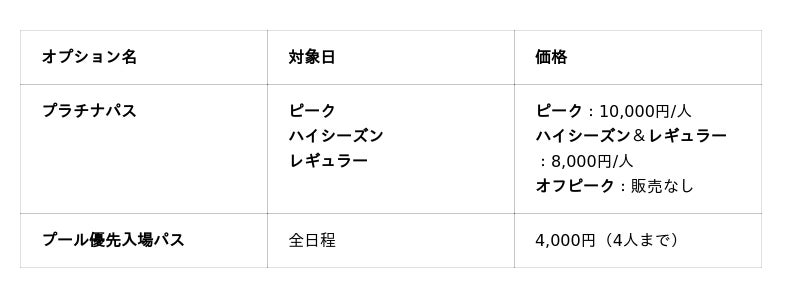 ネスタの夏をより自由に楽しむ3つのオプションをご用意しました。スライダーの待ち時間を気にせず何度でも滑れる「プラチナパス」、オープン30分前から入場できる「プール優先入場パス」、そしてシーズンを通して楽しめる「プールシーズンパス」。思いっきり、ウォーターフォートを楽しみ尽くそう!
