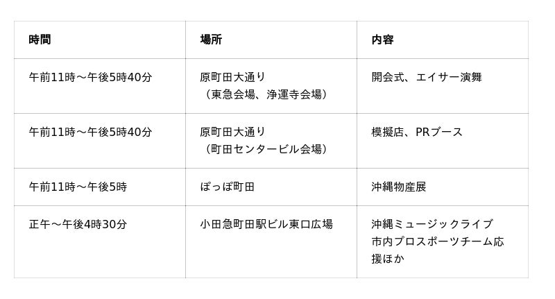 5月10日(日)には、原町田大通り東急会場・浄運寺会場で、エイサー団体が演舞を披露します。また、今年もPRブースを設営するほか、模擬店が出店され飲食等を楽しむことができます。