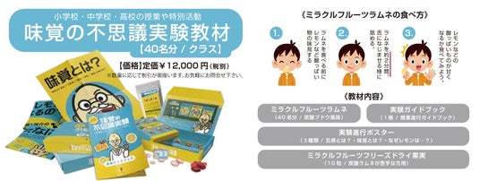 内容:ミラクルフルーツラムネ(40名分 / 炭酸ブドウ風味ラムネ)・実験ガイドブック(1冊 / 授業進行ガイドブック)・実験進行ポスター(3種類 / 五感とは?・味覚とは?・なぜレモンは…?)