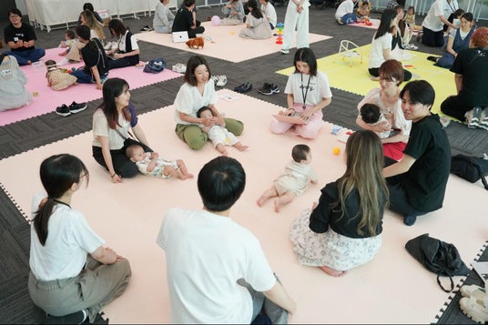 合間には、自由な休憩タイムが設けられました。会場に設置されたフォトブースにて、お子さんとのツーショットや家族写真を撮っている姿がみられました。また月齢が近い赤ちゃん同士が床に広げられたおもちゃで無邪気に遊んだり、ママたちが情報交換をしたりと、オフラインならではのあたたかい交流の場となりました。
