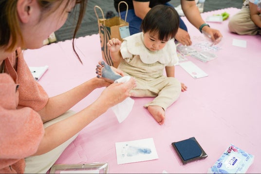 イベント後半は、『トモニテ』のSNSコンテンツの中でも特に大ヒットだった「お花の手形足形アート作り」のワークショップを実施。参加されたお子さんの手形や足形を、お花のシールで彩るアートは、会場でも大盛況でした。
