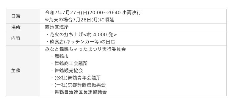 京都府舞鶴市において、舞鶴市西地区の海上に約4,000発の花火を打ち上げる「みなと舞鶴ちゃった花火大会2025」を実施します。多くの皆様に楽しんでいただける機会となることを期待しております。