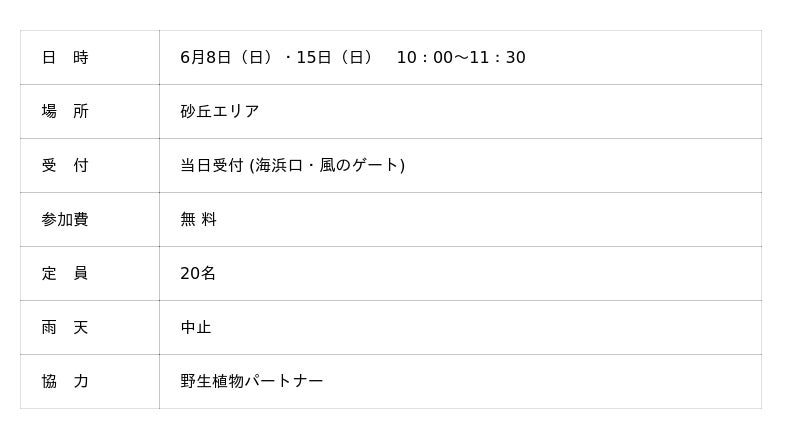 ハナハタザオの開花期にあわせ、野生植物バートナーによる特別ガイドツアーを開催します。砂丘エリアに咲く希少な植物を実際に見ながら、植物と環境のつながり、保全の取り組みについて、わかりやすく解説します。