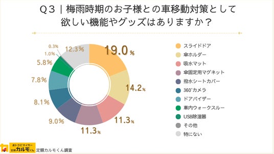 「傘ホルダー」や「吸水マット」「傘固定用マグネット」は、Q2で実際に行っている対策として多くの方があげていた一方、実際に行っている対策では少数だった「スライドドア」が2割近くを占めて最多だったことから、梅雨時期の子供とのお出掛けが快適になる機能を求めてはいるものの、車の買い替えまでは検討せず、手軽な雨対策グッズで工夫していることがわかります。