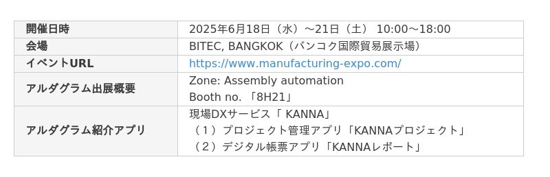ノンデスクワーク業界における生産性向上に取り組む株式会社アルダグラム(本社:東京都港区、代表取締役:長濱光、以下:アルダグラム)が提供する現場DXサービス「KANNA(カンナ)」が、2025年6月18日(水)から21日(土)でタイ・バンコクのBITEC(Bangkok International Trade & Exhibition Centre)で開催される製造業向け展示会「Manufacturing Expo 2025」に初出展します。今回の出展を通じて、製造業領域における事業拡大をさらに加速してまいります。