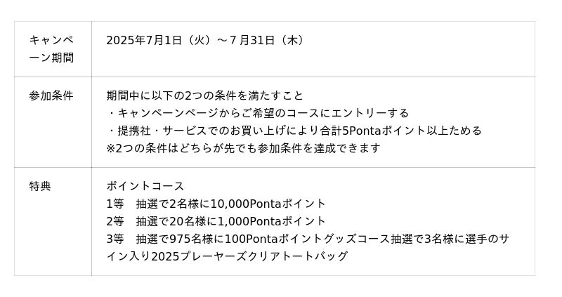 さらに、グランパスポンタDAYを含む、2025年7月1日(火)~7月31日(木)、「グランパスポンタキャンペーン」を開催します。キャンペーンページでご希望のコースにエントリーし、対象提携社・サービスでのお買い上げにより合計5Pontaポイント以上ためた方の中から、抽選で合計1,000名様に最大10,000Pontaポイントや選手のサイン入りグッズをプレゼントします。