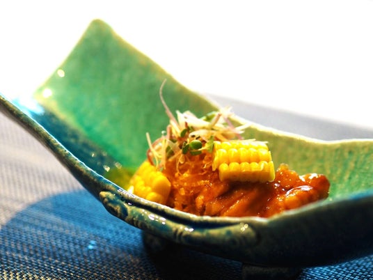 ゆっくりと時間をかけ、蒸して柔らかくして下ごしらえしたアワビ。その上に、裏ごししたアワビの肝や醤油、生クリーム等で仕立てたソースをかけてまろやかに仕上げています。