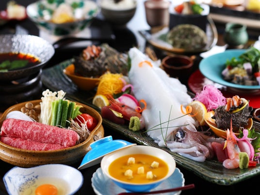 山陰湯村温泉湧泉の宿ゆあむでは、夏ならではの特選食材【白イカ姿造り・アワビ・但馬牛・但馬鶏】を愉しめるプランをご用意いたしました。