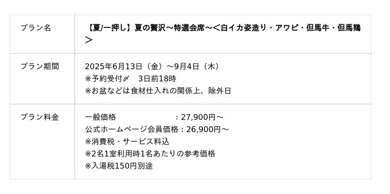 アイアンドエフ・ビルディング株式会社(本社:大阪市北区、代表取締役:泉 邦治)が運営するビナリオホテルズ&リゾーツの施設の1つ「山陰湯村温泉 湧泉(ゆうせん)の宿ゆあむ」(兵庫県)では夏の味覚<白イカ姿造り・アワビ・但馬牛・但馬鶏>が愉しめる夏の贅沢/特選グルメプランを2025年6月13日(金)~9月4日(木)にご提供いたします。