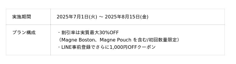 旅行用品の企画・製造・販売を手がける旅行ジャパン株式会社 (本社:東京都渋谷区、代表取締役CEO:猿渡歩) は、「強さと軽さ」をテーマにした新旅行ブランド『Magne (マグネ) 』を発表。第1弾となる新製品として、世界で初めてボディ全面にマグネシウム合金を採用した金属製スーツケース「Magne Suitcase」を、2025年7月1日(⽕)~8月15日(金)の期間限定で、株式会社マクアケ (所在地:東京都渋谷区、代表取締役社長:中山 亮太郎) が展開する日本最大級の応援購入サービス「Makuake」において、先行販売致します。