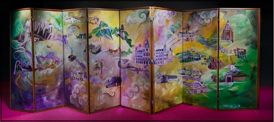 シュタイヤマルクの建物や自然を⾊鮮やかに描いた幅4メートルのこの屏風。シュタイヤマルク産のウォールナット材を用いています。『豊⾂期大坂図屏風』へのオマージュであるとともに、シュタイヤマルクと関西の架け橋をビジュアル化した作品でもあります。