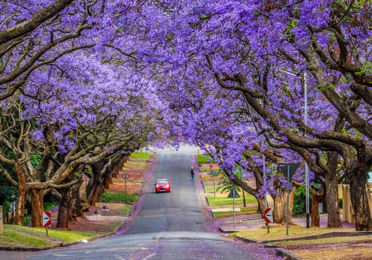 “ジャカランダシティ”の愛称をもつプレトリアでは、10月になると街路樹が一斉に色づく様子を見ることができます。紫のトンネルのように続く並木道と、舞い落ちる花びらが描く風景は幻想的です。