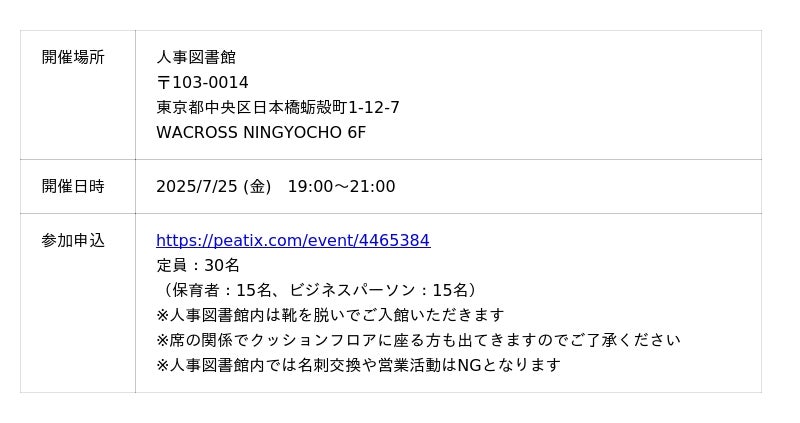 株式会社Trustyyle(本社:東京都中央区・代表取締役:吉田洋介)は、運営するコミュニティ「人事図書館」主催にて、対面イベント 「主体性って何だろう 「保育」と「ビジネスパーソン」が交わる新たな越境」を開催いたします。保育者用チケットとビジネスパーソン用チケットをそれぞれご用意しております。みなさまのご参加をお待ちしております。
