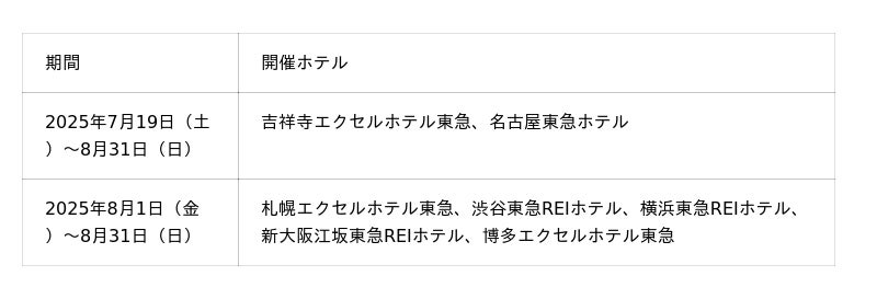 東急ホテルズ&リゾーツ株式会社(東京都渋谷区、取締役社長 村井 淳)は、2025年7月19日(土)から8月31日(日)までの期間、全国6都市の7つのホテルにて、アニメ「鬼滅の刃」とのコラボレーション企画「鬼滅の刃×東急ホテルズ スペシャルブッフェ 2025」を開催いたします。