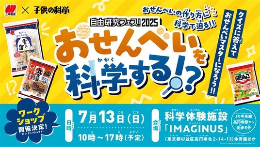 「雪の宿」「ぱりんこ」などのおせんべいメーカー・三幸製菓による「おせんべいの科学」ワークショップ。クイズに答えておせんべいの味の秘密に迫ろう!
