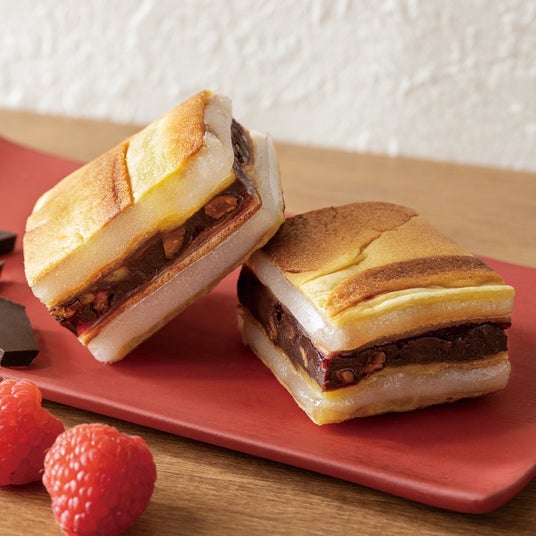 お餅に甘く煮つめた和くるみを練りこみシュー生地でサンドした羽二重くるみにチョコレートガナッシュとフランボワーズジャムを合わせた和洋折衷のお菓子です。