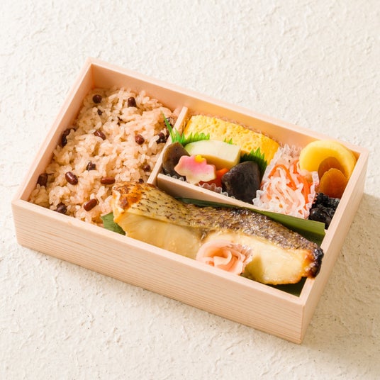 〈六行亭〉真鯛粕漬と赤飯のお祝い弁当