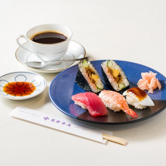 鮪1貫、海老1貫、テリイカ1貫、変わり上巻2切れにホットコーヒーがついたモーニングセット。お寿司とコーヒーの相性も◎