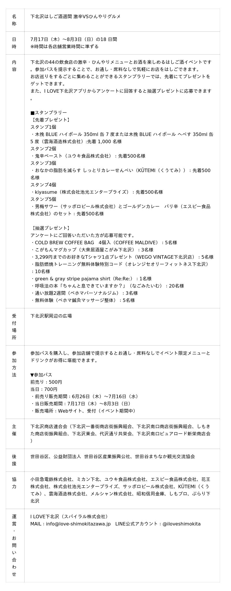 下北沢の個性豊かで魅力あふれる飲食店メニューを特別価格ではしご酒できる、お得なイベントです。今回は真夏にぴったりの「激辛」と「ひんやり」をテーマに開催いたします。