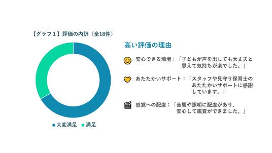 アンケートに回答した18組中、12組が「大変満足」、6組が「満足」という回答でした。特に、「子どもが声を出したり立ち上がっても大丈夫という安心感」が満足度につながったことが分かりました。