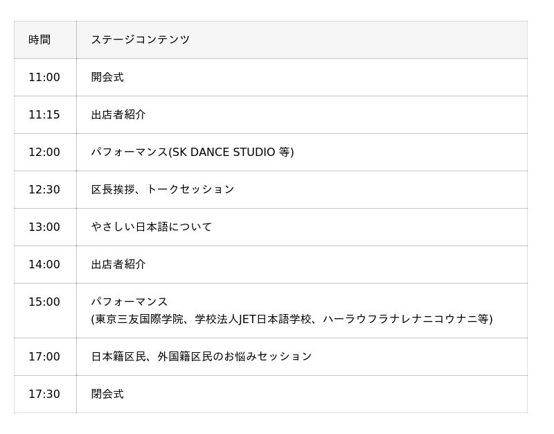 [やさしい日本語]をベースに、防災アプリの紹介や給水車体験、ゴミの分別や出し方の体験、多国籍フードブース、多国籍文化、ステージパフォーマンス、スポーツ体験等、子供から大人まで楽しめるイベントです。どなたでも無料でご参加いただけます!
