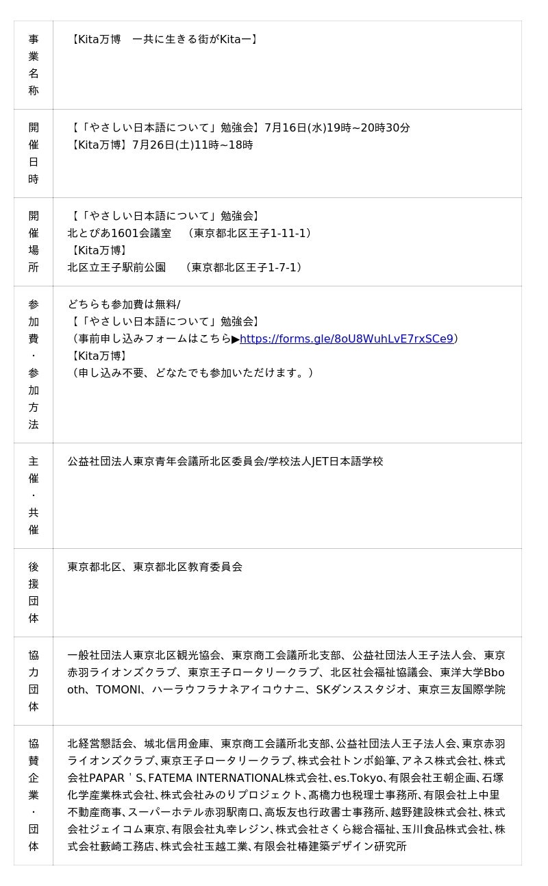 本事業は、7月16日(水)19時~20時30分に北とぴあにて開催される「やさしい日本語について」勉強会、7月26日(土)11時~18時に北区立王子駅前公園にて開催される「Kita万博」の二部構成となっております。