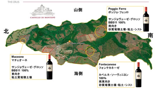 カステッロ・ディ・モンテポでは、ビオンディ・サンティ家にとって大切なサンジョヴェーゼ・グロッソ BBS11のポテンシャルを最大限に生かす小区画を、モンテポ領地内で30年以上かけて探求し、その栽培環境の研究を重ねてきました。その結果、適性が高いと判断されたわずか3区画・Maceone(マチェオーネ)、Poggio Ferro(ポッジョ・フェッロ)、Fontecanese(フォンテカネーゼ)に絞ってCruシリーズを展開。2019年ヴィンテージが初リリースされました。年間生産はおよそ3,000本程度に限られており、非常に希少な存在です。