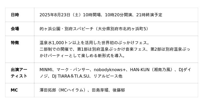 2025年8月23日(土)、大分県・別府スパビーチにて「BOB2025(別府温泉ぶっかけフェス)」(以下、「BOB2025」といいます。)が開催されます。