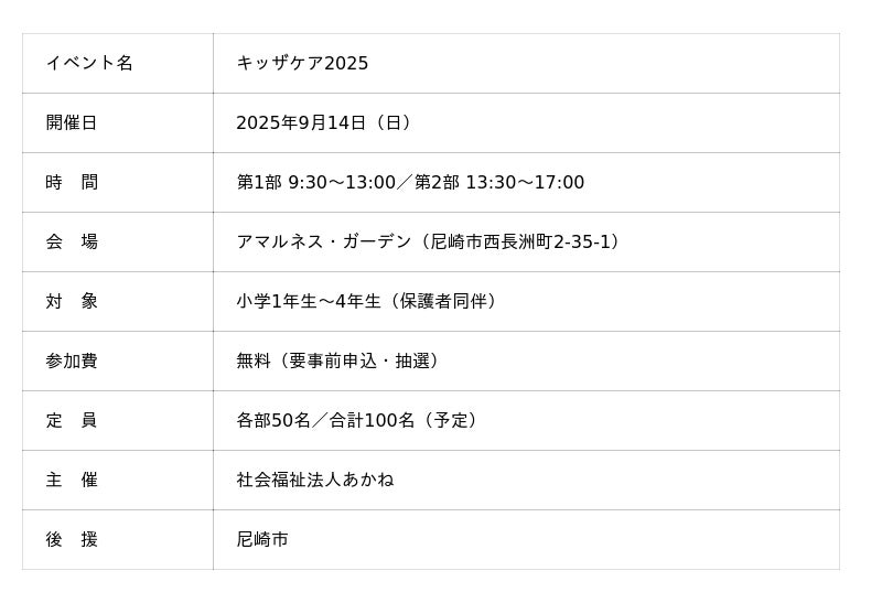2025年9月14日(日)尼崎市の福祉施設「アマルネス・ガーデン」にて、子ども向け職業体験イベント「キッザケア 2025」を開催いたします。(主催:社会福祉法人あかね/後援:尼崎市)