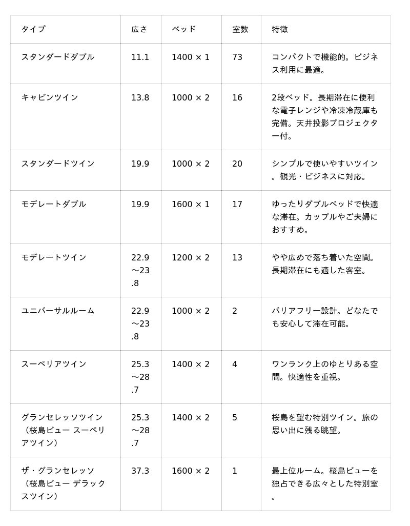 スタンダードダブルやモデレートツインに加え、電子レンジや2段式冷凍冷蔵庫、大容量バゲージスペースを備えた長期滞在におすすめの「キャビンツイン(2段ベッド)」や、アメニティにこだわった「レディースルーム」、3世代に対応できるコネクティングルームなど、ご滞在のニーズに合わせた多様な客室を備えております。また、最上位ルーム「ザ・グランセレッソ」では、時間によって移り変わる桜島の美しい姿を大パノラマでこころゆくまで堪能いただけます。全室43型以上のテレビを備え、ミラーリングやTVインターネットコンテンツも楽しめます。