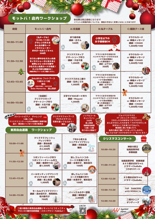 株式会社AgeWellJapan(本社:東京都渋谷区、代表取締役社長:赤木円香)が運営する多世代コミュニティスペース「モットバ!」は、ジョイナステラス二俣川(運営:株式会社相鉄ビルマネジメント)が推進する地域コミュニティプロジェクト「マチナカマ」と連携し、2025年12月6日(土)、横浜・二俣川で多世代交流フェスティバル「MOTTOBA!Winter FES. 」を開催します。