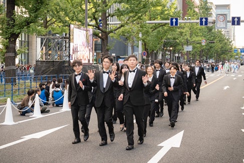 沿道の声援を受け晴れやかに御堂筋をウォーキングする学生たち