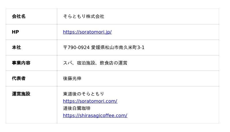 そらともり株式会社は「健康と楽しさと豊かさ創造」を経営理念に、愛媛県松山市で宿泊温浴施設『東道後のそらともり』、道後温泉街で『道後白鷺珈琲』を運営。独自性に溢れたリトリート空間や商品を通じて、多くの方々に滞在する喜び、幸せを届けるサービスを提供。