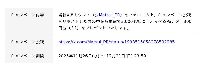 ※1 「えらべるPay(R)」は、株式会社ギフティが提供するデジタルギフトであり、様々なスマホ決済サービスポイントの中から贈呈された「ギフトポイント」内でお好きな商品と交換することができます。「えらべるPay(R)」および「ギフトポイント」の利用には、会員登録やアプリダウンロードの必要もなく、保有ポイント内で複数の決済サービスポイントを選ぶことも可能です。
