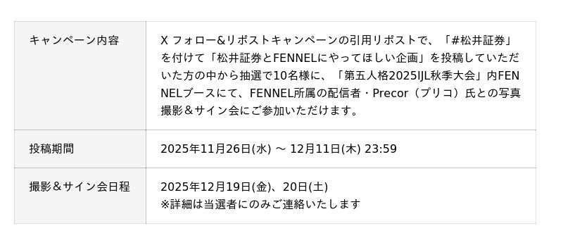 本キャンペーンは、期間中に当社Xアカウントのフォロー&リポストをすることが参加条件となります。キャンペーンに参加すると、抽選3,000名様に「えらべるPay (R)」(※1)をプレゼントいたします。また、大会期間中にFENNELブースにご来場いただき、抽選結果画面をスタッフにお見せいただくことで、先着でFENNELオリジナルステッカーをプレゼントいたします。さらに、Xで「松井証券とFENNELにやってほしい企画」を投稿いただいた方の中から抽選で、FENNELの人気配信者・Precor(プリコ)氏との写真撮影&サイン会にご招待いたします。