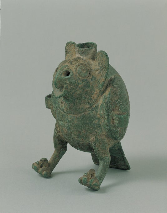 鴟鴞形水滴(しきょうがたすいてき) 中国・六朝時代・3~5世紀 大阪市立美術館蔵 山口コレクション 鋳造によって制作された古代中国の金属器。フクロウの類の鳥をモデルとしている。顔、目鼻立ちが大きく、ユーモラスな表情をするが、フクロウは古(いにしえ)の中国では霊鳥の一種と捉えられた。頭上の穴にスポイト状の滴管を挿入して用いられた。