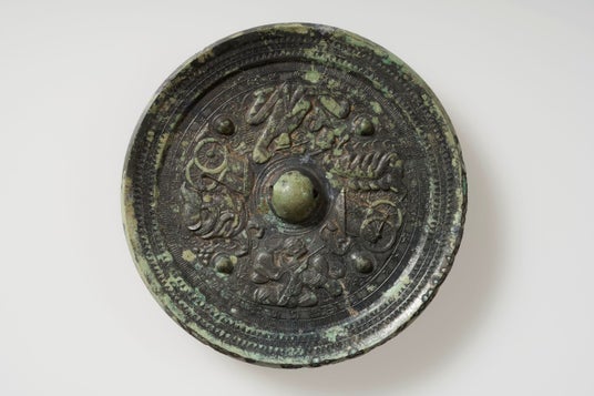 美術館と所蔵・寄託品を先人から継承し、後世に渡していくためには、美術品の修復と研究が欠かせません。本章では、修復の実例と学芸員の研究成果を紹介し、未来へ繋ぐ物語を『全力』で紡ぎます。【重要美術品】青銅 伍子胥画像鏡(せいどう ごししょがぞうきょう) 中国・後漢末~三国時代・3世紀 大阪市立美術館蔵 山口コレクション 2023年度に修復が行われた銅鏡。鏡全体が、大きく3つに割れており、過去にも修復がなされたが、改めて強化・補強、過去の修理痕の除去等を行った。伍子胥は、紀元前6~5世紀の人物。父と兄の敵討ちの説話で古来知られる。