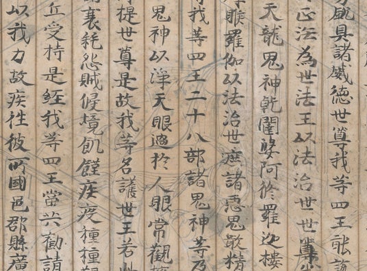 【国宝】物語下絵料紙金光明経(目無経)(ものがたりしたえりょうしこんこうみょうきょう(めなしきょう)) 巻第二(部分)鎌倉時代・建久3年(1192)頃 大阪市立美術館蔵 武藤経三氏遺贈【前期展示】後白河法皇の崩御に伴い、法皇企画のもと制作途中であった物語絵巻の下絵を菩提弔いのための写経の料紙とした。下絵のため、人物には目鼻がほぼ描かれない。物語は判然としないが、蓬髪の異形も認められる。