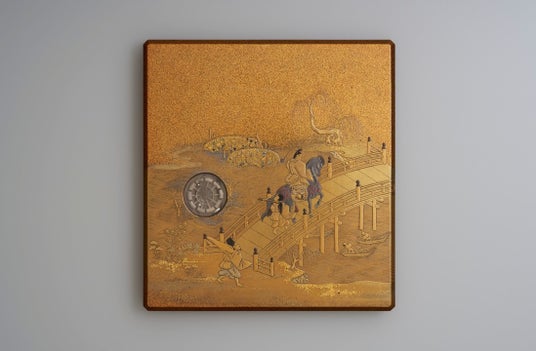 橋姫蒔絵硯箱(はしひめまきえすずりばこ) 江戸時代・18~19世紀 大阪市立美術館蔵 カザールコレクション研出蒔絵、高蒔絵などによって『源氏物語』(蓋表)と『伊勢物語』(蓋裏)の内容の一節を描写する。蓋表の象牙製の水車は、水銀が上方から流れ出てくるくると回転する。各種の技法が駆使された優品。