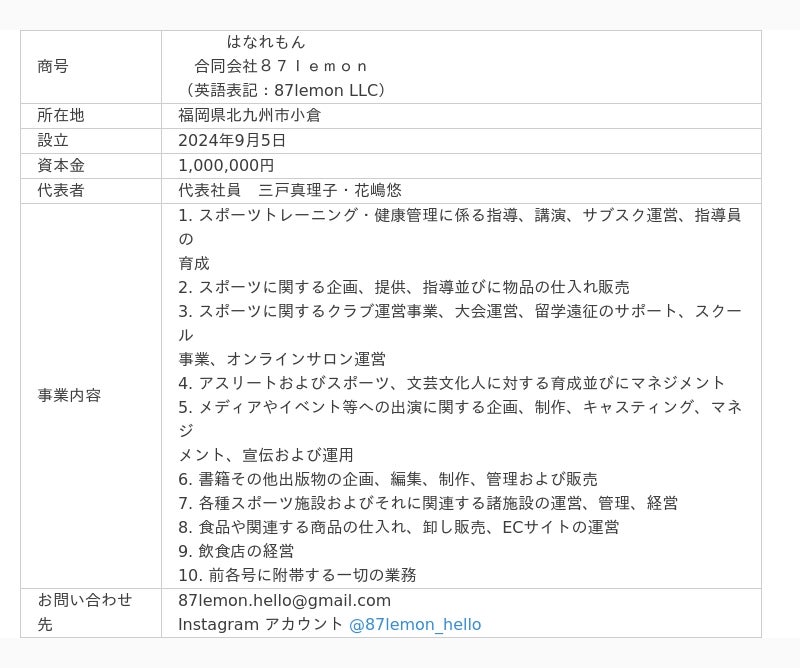 アスリートを中心に、自分の限界を超えるための身体づくりやメンタル強化をサポートする87lemon LLC(合同会社はなれもん、本社:福岡県北九州市、代表社員:三戸真理子、以下:当社)が、2024年9月5日に設立したことをお知らせいたします。87lemon LLCは遺伝子や血液タイプに合わせてパーソナライズされた食事の提案と、トップアスリートが実践してきた体づくりやメンタルのトレーニングを提供します。