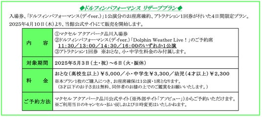 ◆デイver.「Dolphin Weather Live!(ドルフィンウェザーライブ)」変わりやすい初夏の空模様をテーマに“天気予報”仕立てでお送りするデイパフォーマンス。軽快なピアノの楽曲にのせてイルカたちが軽やかなジャンプを繰り出す“快晴”の一幕から始まり、続くのは水中ダンスで表現する情緒的な雨降りのシーン。ラストはアクアパークの“LIVE”なお天気