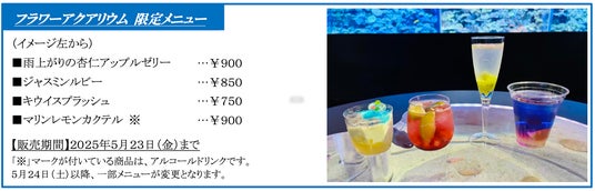 こちらではフラワーアクアリウム限定メニューをご用意しており、ラインナップはシトラスやキウイ風味のドリンクをはじめ、鮮やかなブルーが目を引くカクテル、ひんやりと冷たいスイーツの4種類。